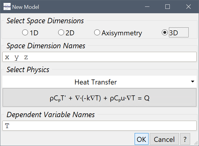 Select the 3D radio button, and the Heat Transfer physics mode from the Select Physics drop-down menu. Then press OK to finish the physics mode selection.