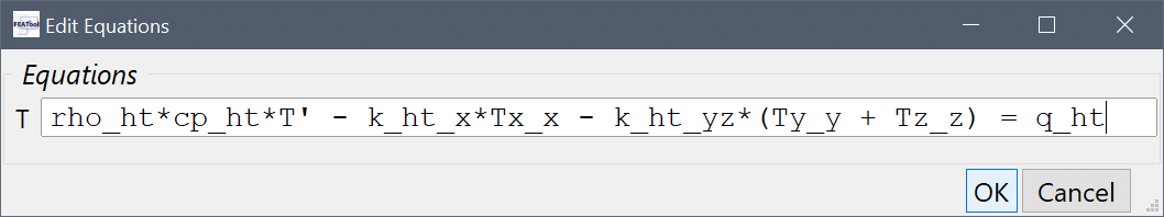 To change the equation, press the edit button and enter rho_ht*cp_ht*T' - k_ht_x*Tx_x - k_ht_yz*(Ty_y + Tz_z) = q_ht into the Equation for T edit field (note that the connective term has been omitted as it does not contribute in this simulation). Press OK to finish and close the dialog box.