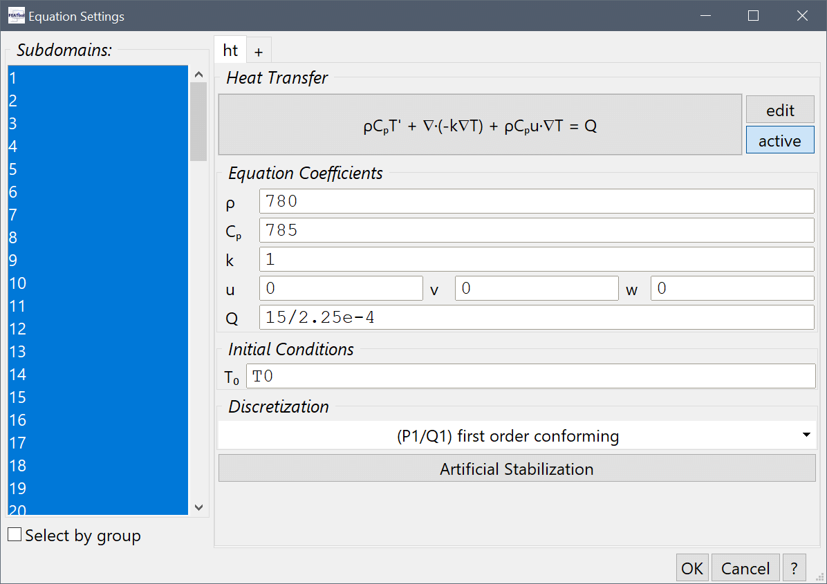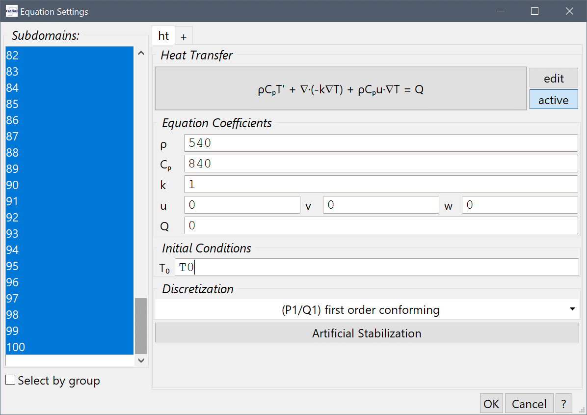 Finally, select all domains and set the initial temperature T0 to the expression T0 (to be defined later).