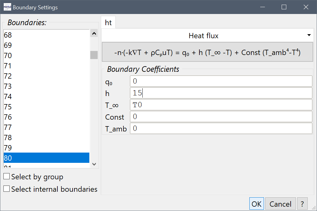 15 into the Heat transfer coefficient edit field, and T0 into the Bulk temperature edit field.Press OK to finish the boundary condition specification.