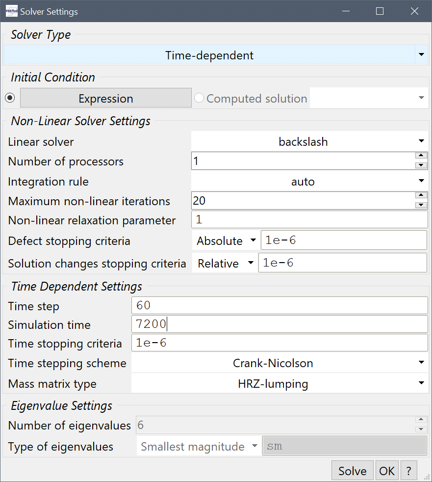 Select Time-Dependent from the Solution and solver type drop-down menu, enter 60 into the Time step size edit field, and 7200 into the Duration of time-dependent simulation (maximum time).