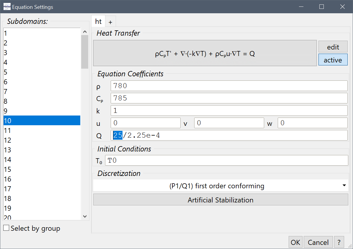 Select 10 in the Subdomains list box, and Enter 25/2.25e-4 into the Heat source, Q edit field.