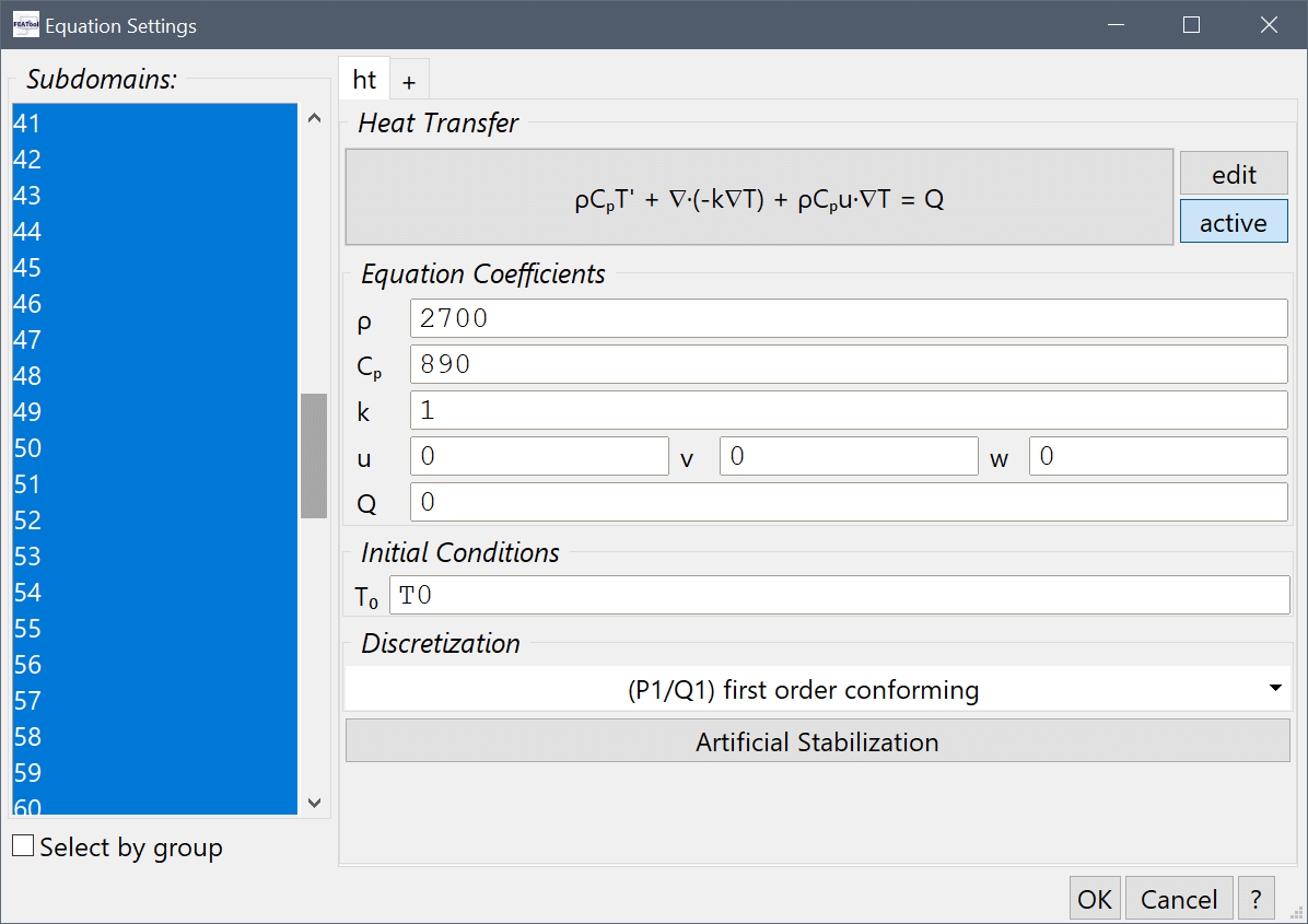 Finally, select all domains and set the initial temperature T0 to the expression T0 (to be defined later).