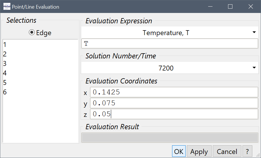 Enter 0.1425, 0.075, and 0.05 into the Evaluation coordinates in x, y, and z-direction edit fields, respectively, and press OK.