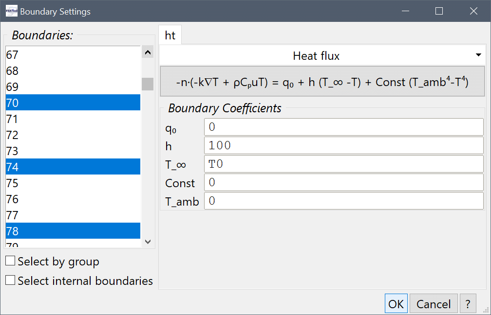 100 into the Heat transfer coefficient edit field, and T0 into the Bulk temperature edit field.Press OK to finish the boundary condition specification.